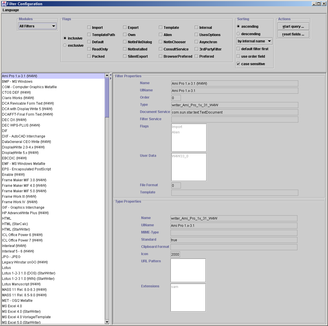 The filter configuration of an office is a very complex mechanism. Configuration data is organized similar to a database, e.g., filters are registered for different types. This data is available, inside an office installation, in a file named TypeDetection.xml. The structure of the file is simple, but the number of entries can be very high, e.g., on a full installation set. Reading and editing large sets isn't easy. That is the reason for this application: to provide a simple access to the data source and also illustrate the use of the office filter api.